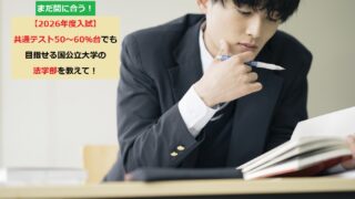 大学受験情報【2026年度入試 法学を学べる学部】共通テスト50~60%台でも目指せる国公立大学の法学部を教えて!【まだ間に合う!】 こんにちは!四谷学院 受験コンサルタントチームの伊達です。 国公立大学を目指している受験生にとって、最大の壁となる共通テスト。 その点数によって出願する大学を変... 2025.11.29大学受験情報