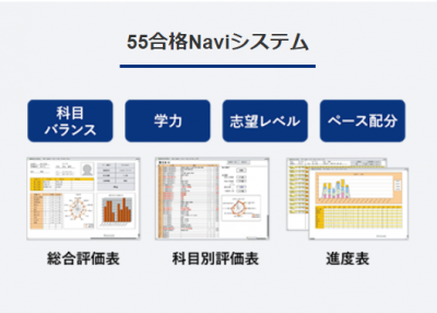 55 Naviシステムでは、あなたの志望校に合格した先輩のデータをもとに逆算して、受験コンサルタントがあなたのペース配分を提示します。今週は○級分の合格を目標にしよう、だから今日は○級合格しよう、という具体的な目標が提示され、常に今の自分のペースで合格できるのか、進度目安がわかるから安心です。