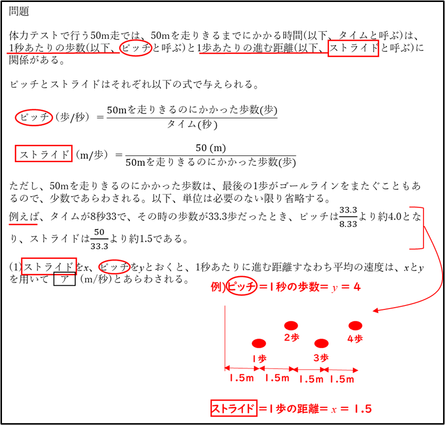 これを踏まえて、(1)で指定された文字で言い換えると、(4歩→y歩、1.5 m=x [m])