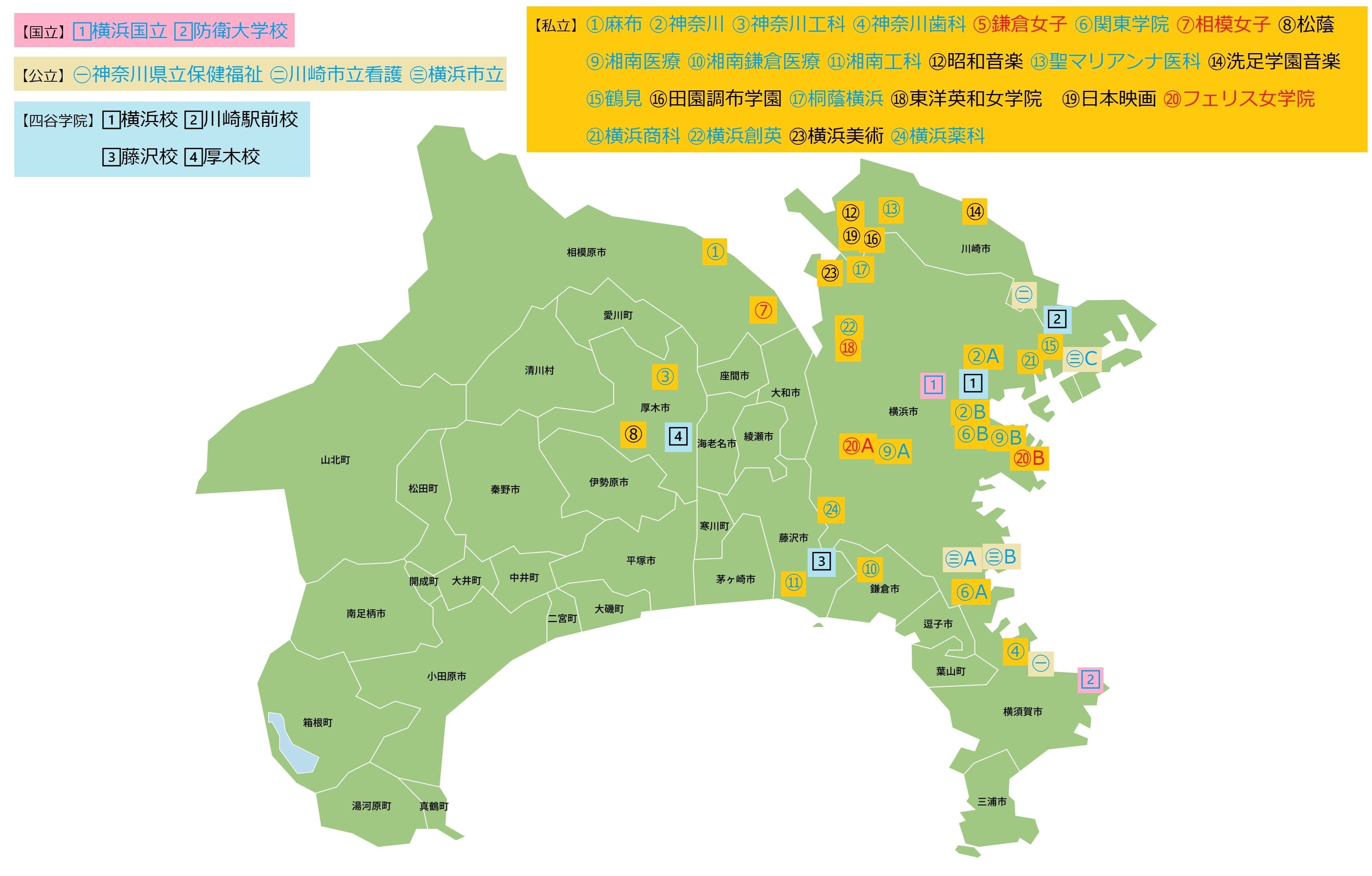 A.津田沼キャンパス:習志野市津田沼2-17-1 最寄り駅:津田沼駅/新津田沼駅(いずれも駅から徒歩で1~3分程度)