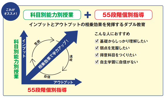 四谷学院は科目別能力別授業と55段階個別指導のダブル教育!インプットとアウトプットの相乗効果が学力アップを実現します。