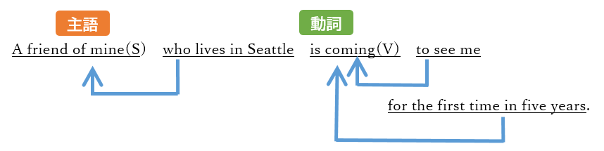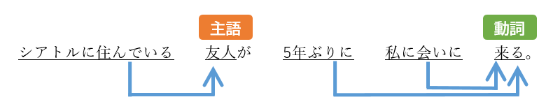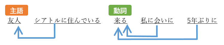 一単語で抜き出せば、主語は「友人」、動詞は「来る」となります。修飾、被修飾語の関係を整理して示すと、
