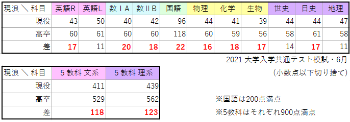 実際、例年5月下旬~6月上旬に実施される共通テスト模試で、現役生と浪人生の平均点を比べてみると、浪人生の方が各科目20点近く上回っていることがわかります。