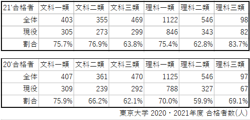 たとえば浪人生の割合がほかの大学よりも高いとされる東京大学でも、合格者の現役生比率はどの学類も6~7割ほど。低い年でも半分を下回りません。
