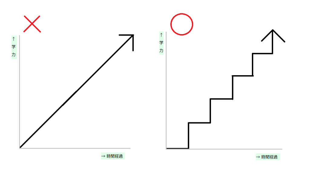 以下のように、「学力は階段状に伸びていく」というイメージを持っておきましょう。
