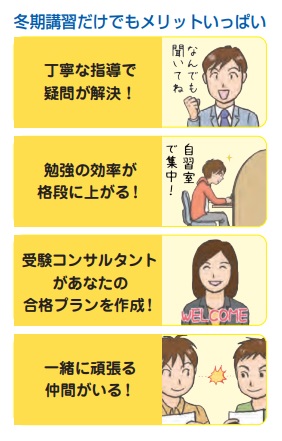 冬期講習を受講する場合には、日程の偏りがないように受講しましょう。勉強のペースを崩さないようにすることが大切ですから、例えば午前中に1つだけ講座を受けて、そのまま午後は自習室で演習問題をバリバリ解く、というように、冬期講習や自習室などをうまく活用しましょう。