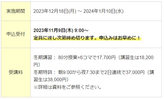 冬期講座は、主に年末年始に行われます。同じテーマの授業が色々な時間帯や校舎で行われることも多いので、効果的に組み合わせましょう。