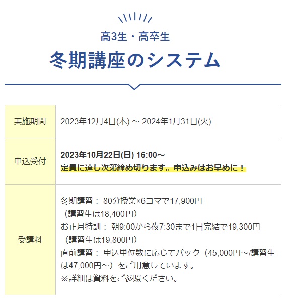 この2つの観点が重要なので、冬期講習では、授業をただ受けるだけでなく演習をたくさん行う講座を受講したり、科目別だけでなく、さらにテーマ別対策ができる講座を選ぶことがおすすめです。
