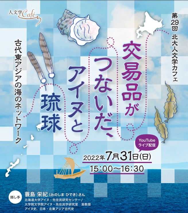 古代の北海道島は、日本や中国などの近隣の王権・国家にとって、王・貴族・武士などの支配者層の欲する多彩な貴重品の産地でした。おもな交易品として、各種の動物の毛皮類や、コンブやサケなどの水産物のほか、高品位な矢羽根として珍重されたワシの尾羽根が脚光を浴びています。古代日本から「南島」と呼ばれた琉球列島も同様で、螺鈿(らでん)原料として利用されたヤコウガイ、宋代の中国で火薬原料として膨大な需要のあった硫黄などの交易が注目されています。こうした多種多様な産物の生産や交易は、アイヌ史や琉球史を根底から動かしただけでなく、しばしば日本や中国、アジア・ユーラシアの歴史を左右する要因にもなりました。今回の人文学カフェでは、こうしたいくつかの交易品の流通に具体的に光をあてながら、それらがときには北方世界と南方世界を直接つなぎ、古代東アジアのグローバルなネットワークを構成する一部となっていたことをご紹介します。