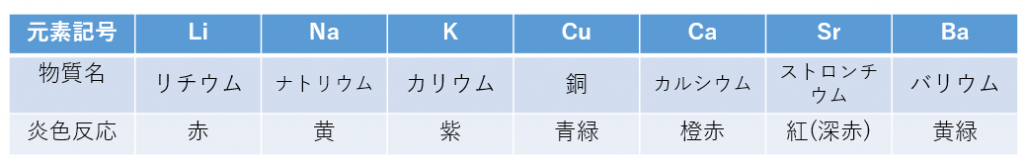 炎色反応とは、水溶液を白金線に浸して炎にかざすと、元素特有の発色をする反応です。炎色反応で登場する色は次のように語呂合わせで覚えている人が多いと思います。