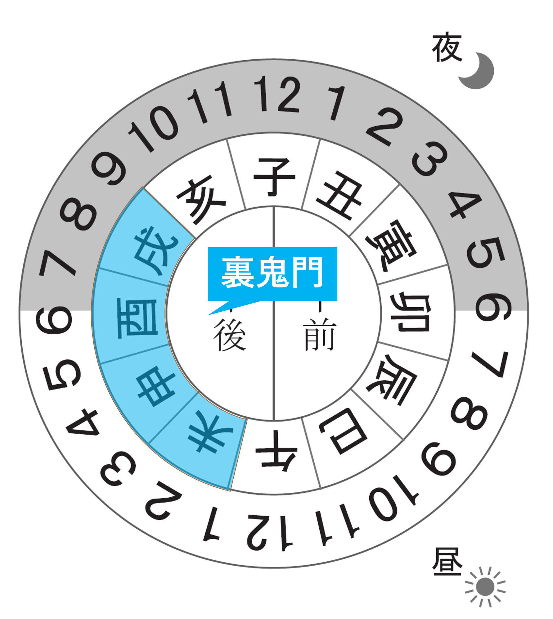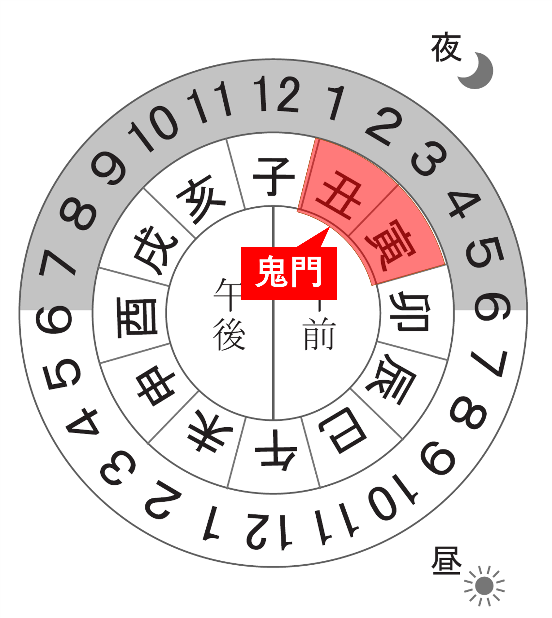 「丑三つ時」は、幽霊や化け物が出る時間と言われるけれど、方角で言うと「丑寅」(東北)に当たるんだよね。つまり鬼門。