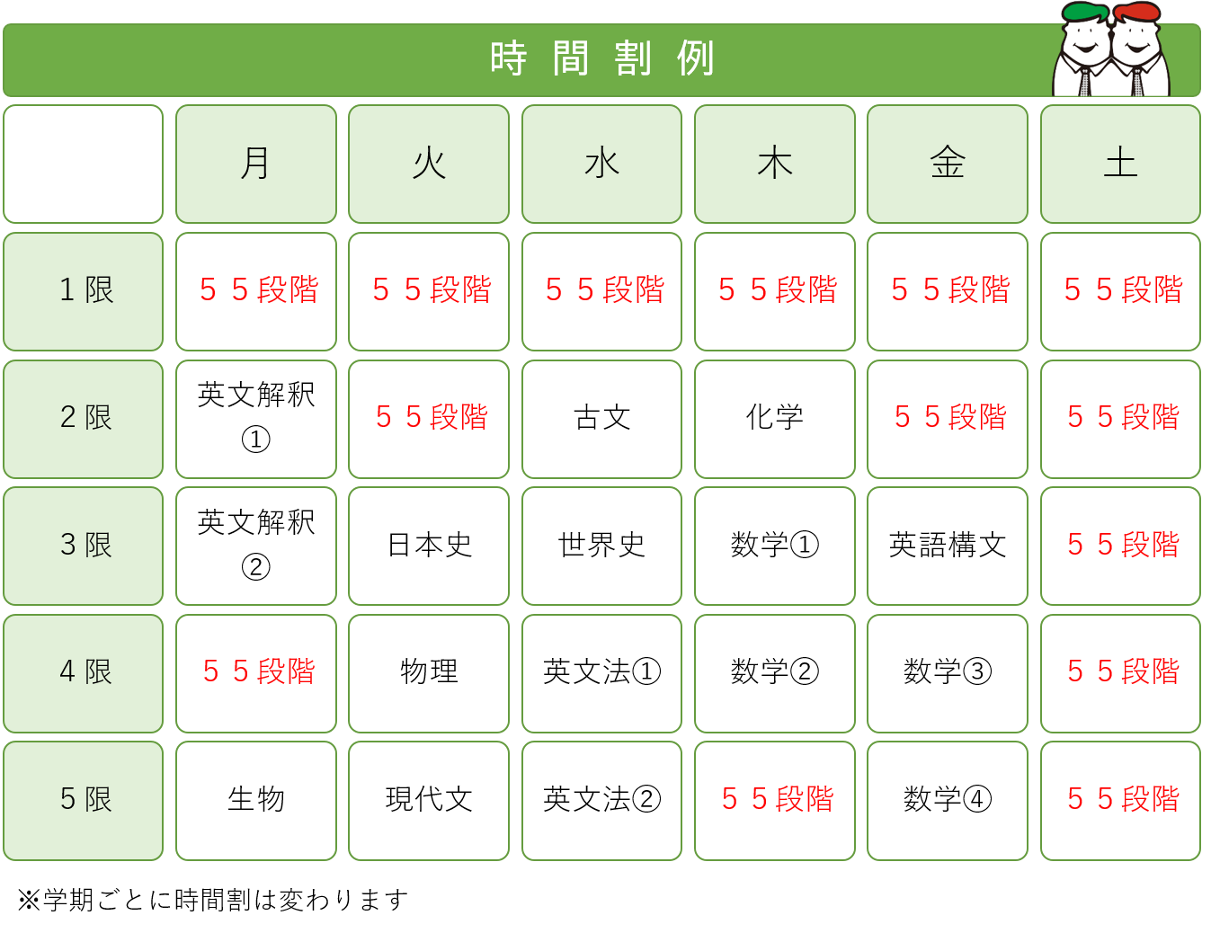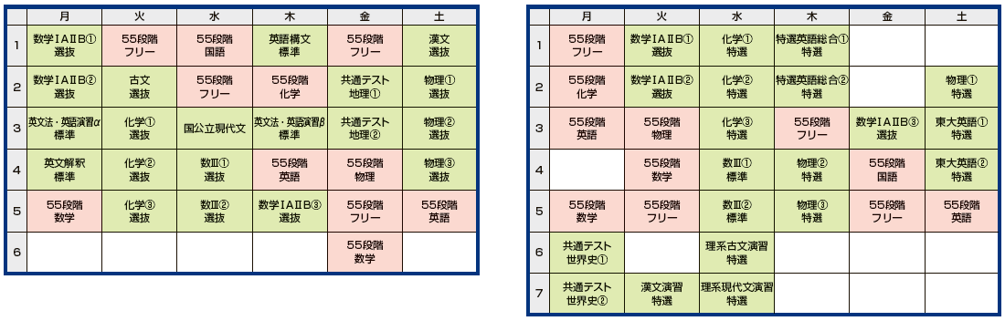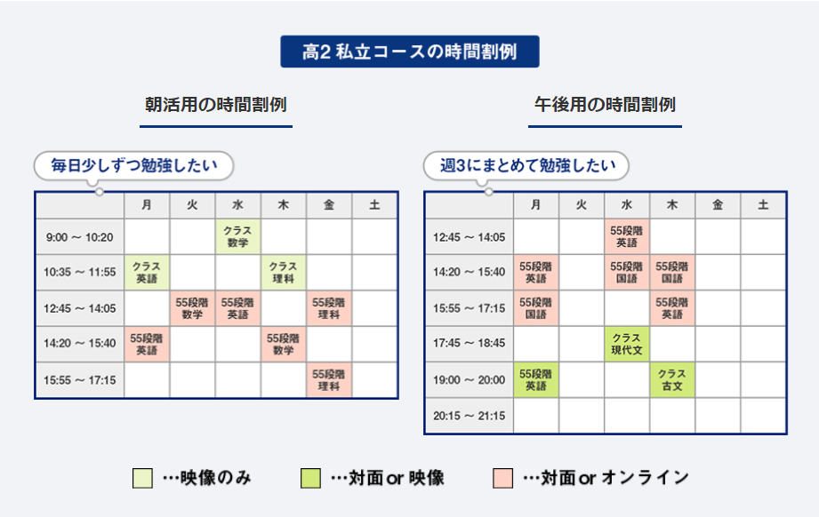 毎日授業があるコースです。午前中から夕方まで授業が行われます。クラス授業は、科目ごとに今のあなたの理解度に合わせた授業で行われ(科目別能力別授業)、55段階個別指導で基礎からしっかり積み上げていくことができます。55段階の最初のSTEPは中学レベルとなっています。