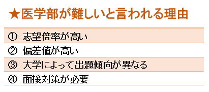 そして2つ目の理由が偏差値の高さです。偏差値70を超える場合もあります。医学部は間違いなく、理系の中で最難関です。3つ目が大学によって出題傾向が異なるということです。4つ目は筆記試験対策だけはなく、面接対策が必要なことです。