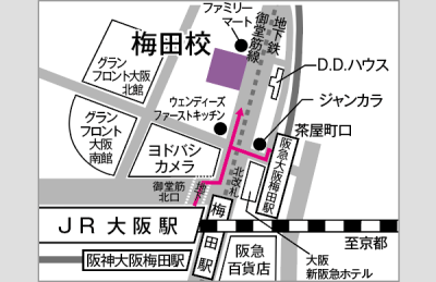 阪急大阪梅田駅茶屋町口より徒歩3分 地下鉄御堂筋線梅田駅北改札より徒歩3分 JR線大阪駅御堂筋北口より徒歩4分