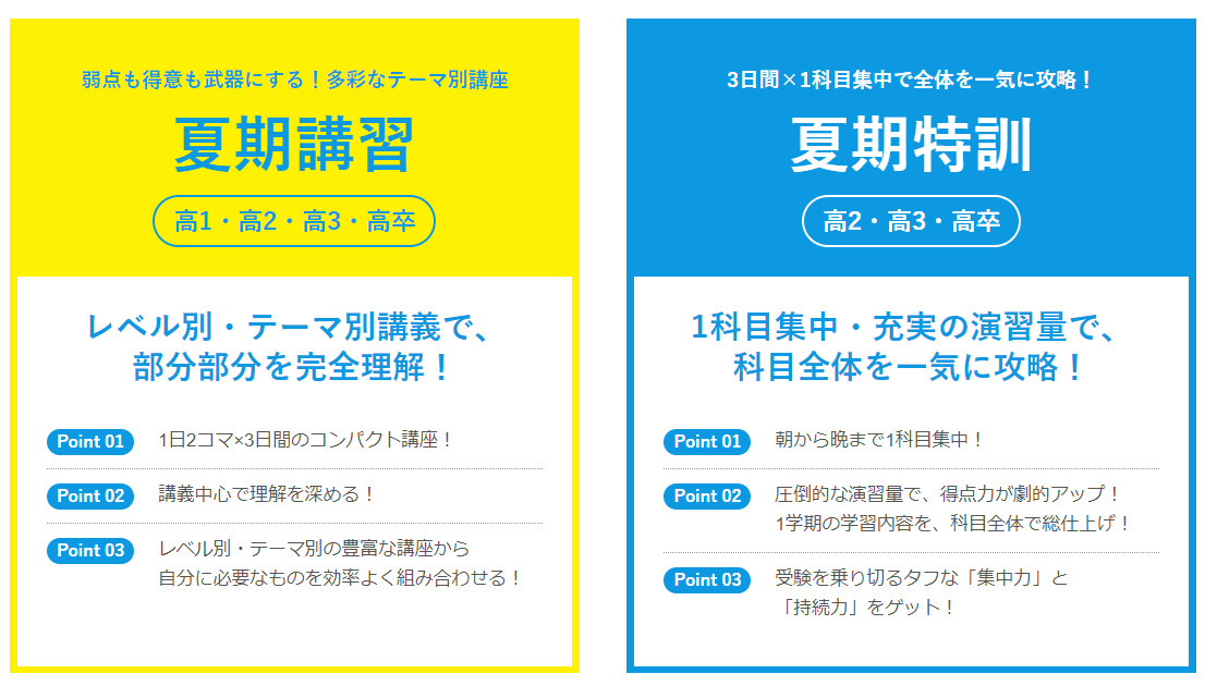 多くの予備校、塾では、その時期、タイミングに合わせた特別なイベントを行っています。例えば、夏には「夏期講習」や「夏期合宿」が行われますよね(コロナの影響で中止になっているところがほとんどですが)。それぞれのイベントには目的がありますが、目的をよく理解しないまま夏を過ごしてしまってはもったいない!