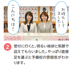 などと笑顔で声をかけられればやる気も出てくるものです。こんにちは、お疲れ様、といったほんの一言が、「勉強する場」を整えてくれます。気持ちよく学べる雰囲気づくりのためには、そこで働く人たちの力が欠かせません。ぜひ校舎に行く際には教室や自習室と言った設備だけでなく、受付の様子やスタッフがどんな姿勢で働いているかもチェックしておきましょう。