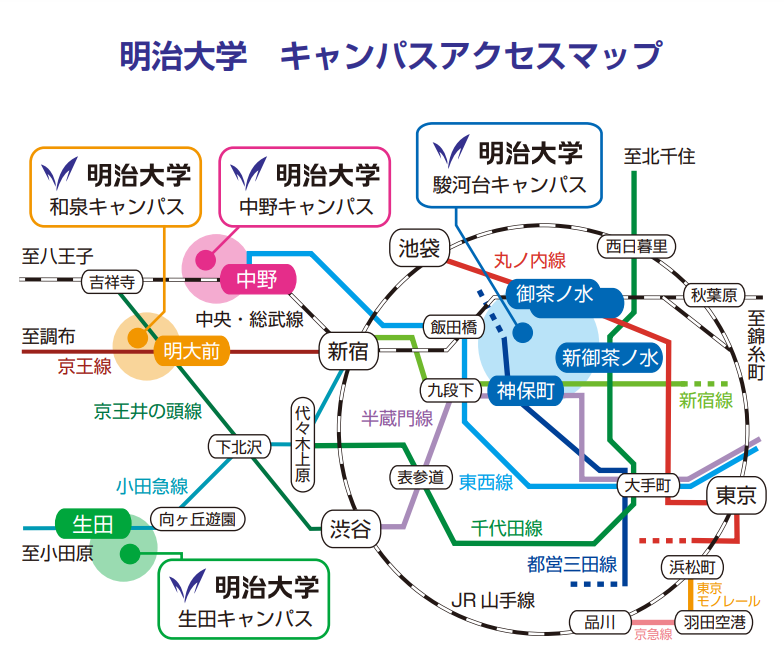 例えば、MARCHの1つである明治大学。多くの文系学部が1・2年次に杉並区の和泉キャンパスで学びます。そして、3・4年次は千代田区の駿河台キャンパスに移動することになります。