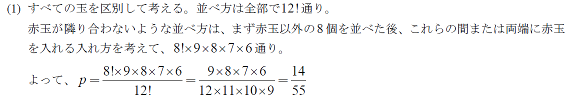 (1) どの赤玉も隣り合わない確率pを求めよ。