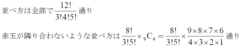 余事象を考えて、「隣り合う赤玉があるような並べ方」を全並べ方から引く、と考えることもできますが、「隣り合う赤玉がある場合」には