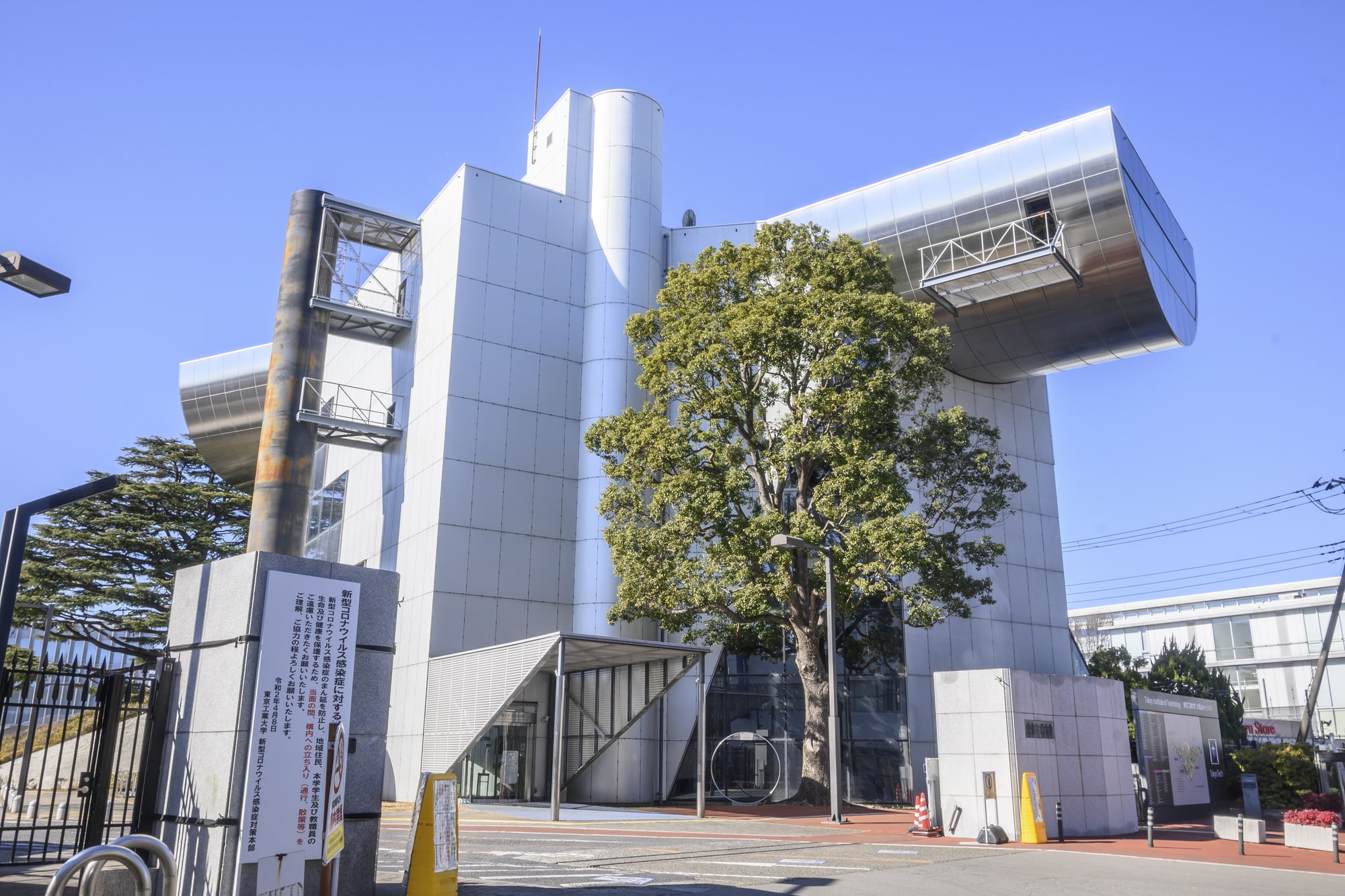 - 半分に割った円柱が張り出しているような外観の東工大博物館