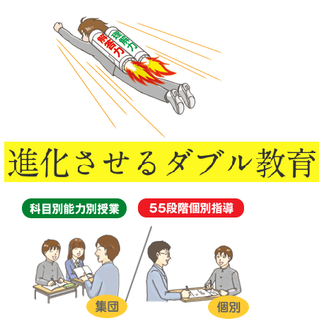 55段階個別指導と科目別能力別授業の「ダブル教育」は、個別指導と集団授業を上手に組み合わせることで大学合格に必要な基礎力を身につけ、実戦力を高めていけます。
