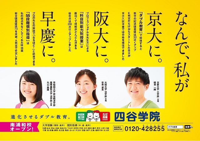 2年連続で不合格を経験しましたが、四谷学院に入学してたった1年で判定をE→Bに伸ばし見事合格。2019年度の四谷学院の交通広告ポスターに掲載されました。