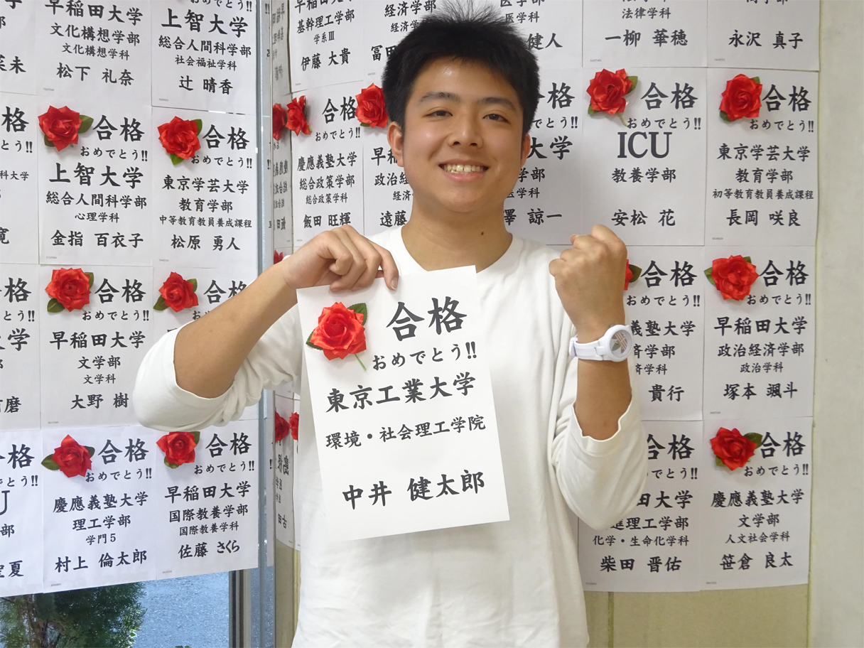 授業の先生方や、いろいろ相談に乗ってくれた受験コンサルタントの先生のおかげで、1年間モチベーションを切らすことなく過ごせました。志望校合格は四谷学院のサポートあってのものだと本当に思います。後輩のみなさん、四谷学院を最大限に活用して勉強してください!