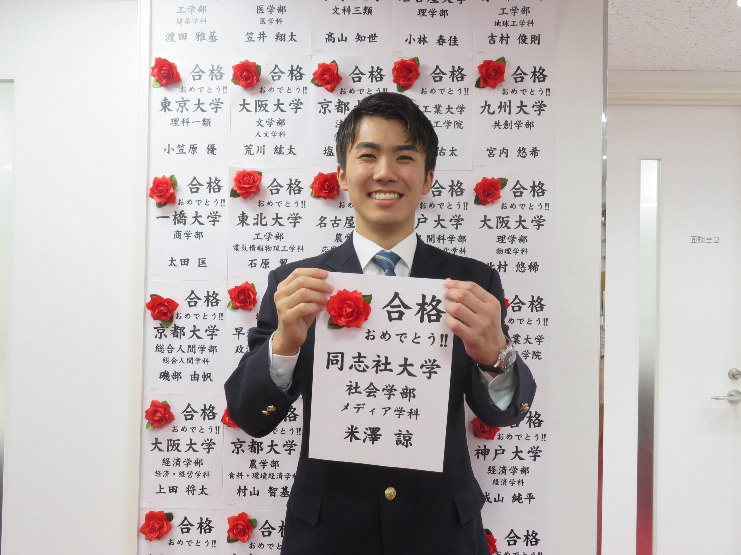 正直受験勉強を始めたときは第一志望なんて受からないと思っていて、ちょうど1年前の今まで勉強をしてこなかった自分がここまで成長できるとは思いませんでした。本当に「なんで私が同志社大に!?」って思いました(笑)。ずっと憧れだった同志社大学に合格できて本当に嬉しいです。将来はテレビ番組のプロデューサーになり、日本中の人々を笑わせられるような番組を作りたいです。