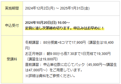 12/1(月)からスタートしており、締切の講座も続々と出てきているため、合格への最終列車に乗り遅れないようにしましょう!