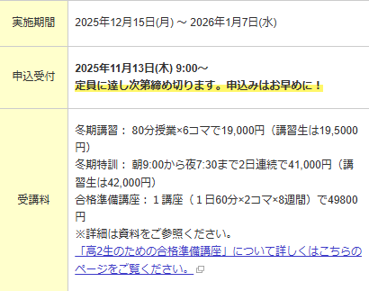 12/1(月)からスタートしており、締切の講座も続々と出てきているため、合格への最終列車に乗り遅れないようにしましょう!