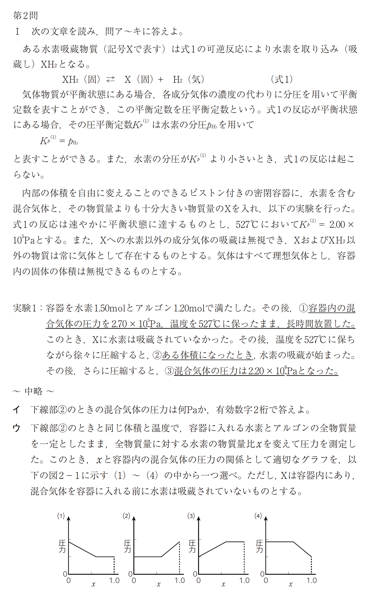このような基本原理の組み合わせにより、問題のポイントが「すべての水素が、気体のままか、吸蔵されて減少するか」という点にあることに気づき、