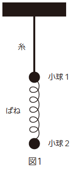 (1) 図1のように、質量mの2つの小球(質点)を糸とばねでつるし、つり合いの位置で静止させた。2つの小球は鉛直方向にのみ運動するものとし、糸がたるんでいないときの小球1の位置を原点として、鉛直下向きを座標軸の正の向きとする。また、小球1は天井にぶつからず、小球同士は衝突しないものとする。