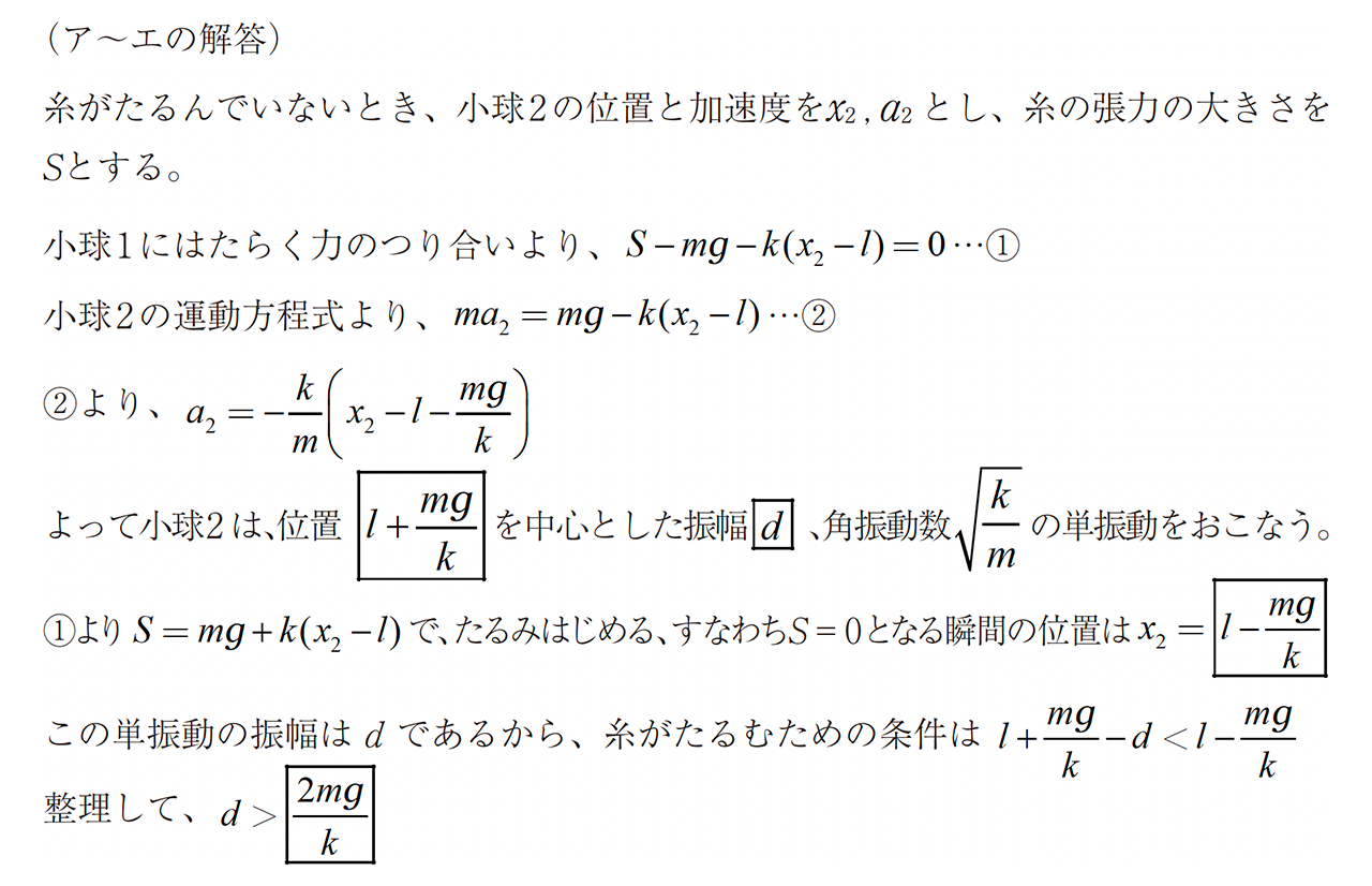 ア中心とした、振幅イの単振動をおこなう。dがある値より大きいときは、運動の途中で糸がたるむ。小球1にはたらく重力、糸の張力、ばねの力のつり合いを考えると、糸がたるみ始めた瞬間の小球2の位置はm, g, k, lを用いてウと表されるので、運動の途中で糸がたるむための条件は、d > エとわかる。