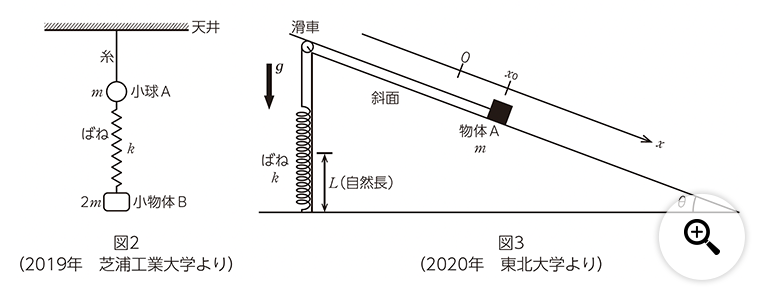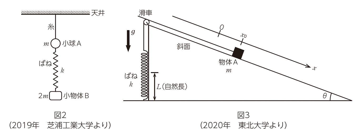 同じようなことを繰り返しお話しする感じになってしまっていますが、物理の勉強はきわめてシンプルです。最小限の道具を徹底的に磨いて、その道具でありとあらゆる物理現象を分析していきます。出題者側が受験生に要求するポイントもシンプルであり、そのため大学の入試物理では似通った題材が繰り返し出題されます。例えば、最初に例示した2020年京大の問題と、2019年芝浦工業大の問題はほぼ同じ状況ですし、2020年東北大の問題は物体の配置は違いますが、問題の解きほぐし方は同じです(下記の図2および図3を参照)。
