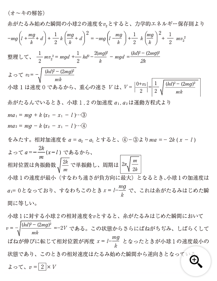 について、糸がたるみ始めてから再びたるみがなくなるまでの運動を考える。2つの小球にはたらくばねの力は、互いに逆向きで大きさが等しいので、重心はばねの力の影響を受けずに鉛直投げ上げ運動をおこなう。糸がたるみ始めた瞬間における重心の速さを m, g, k, d を用いて表すと