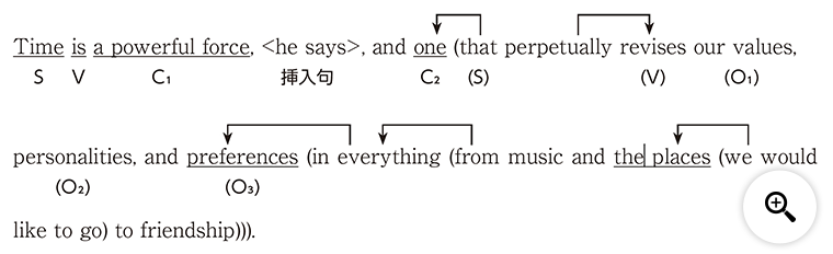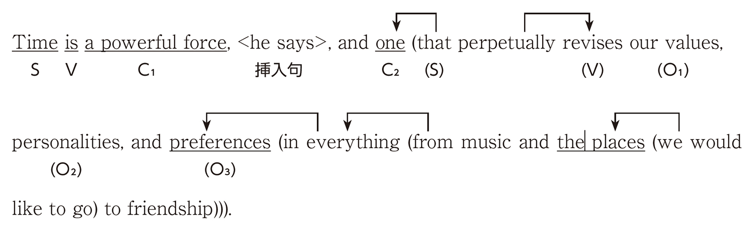 大きな骨格は“Time is a powerful force … and one”という〈S+V+C〉の第2文型で、二つ目のCであるoneに関係代名詞that以下の長い修飾語句が続くという構造になっています。特に注意が必要なのはin everything以下です。everythingには〈from ~ to …〉「~から…まで」という修飾語句が付いていて「~」に該当する要素はここではmusicとthe placesと二つあり、「…」に当たるのがfriendshipです。残った“we would like to go”はthe placesを修飾する関係詞節のかたまりで、weの前には関係副詞のwhereが省略されています。