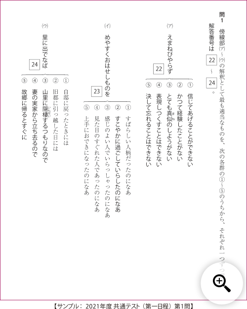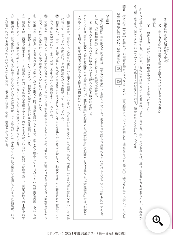 上記サンプルの問5を参照してみましょう。こちらは本文中に出て来る、X・Y、および解説文(【文章】)の中のZを含め、計3首の和歌についての説明として適切な選択肢を二つ選ばせる問題です。