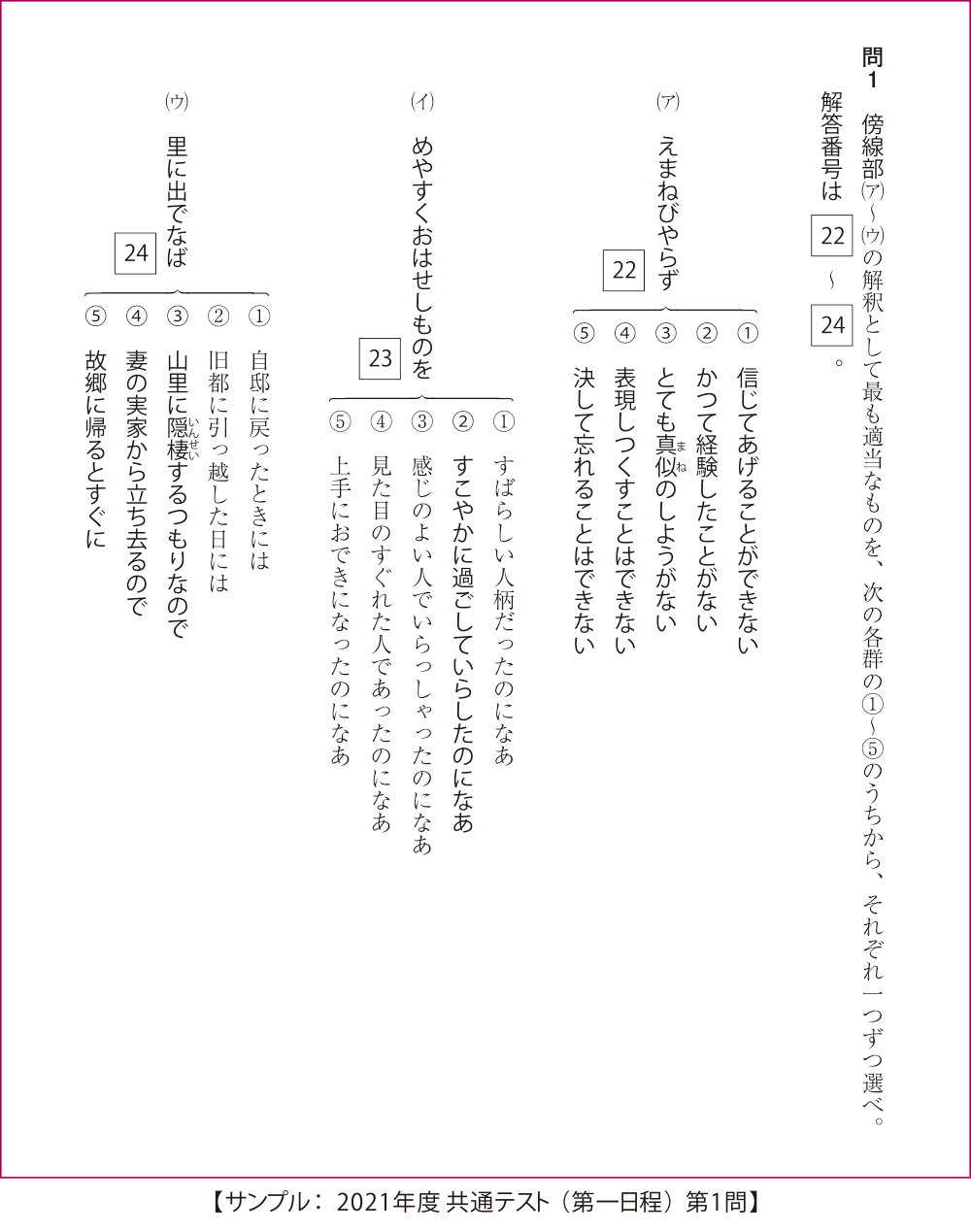 古文では、単語や文法の知識だけで解くことのできる問題があります。上記は2021年共通テスト(第一日程)の古文の問1で、傍線部の解釈として適当なものを聞いていますが、この問題を解くために必要なのは、決して難しい知識ではなく、複数の基本事項を組み合わせることです。