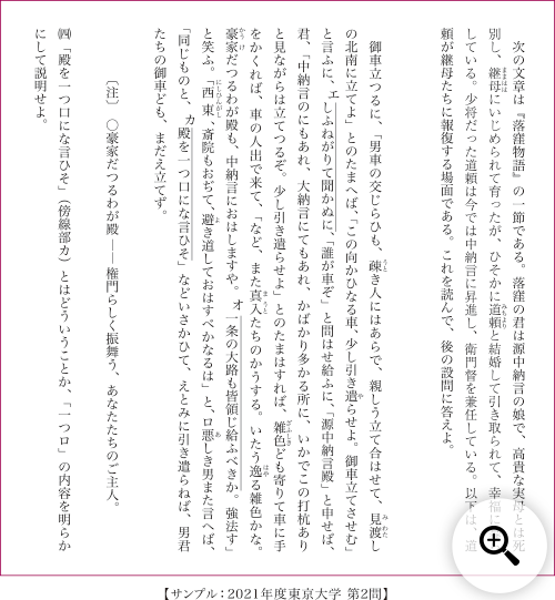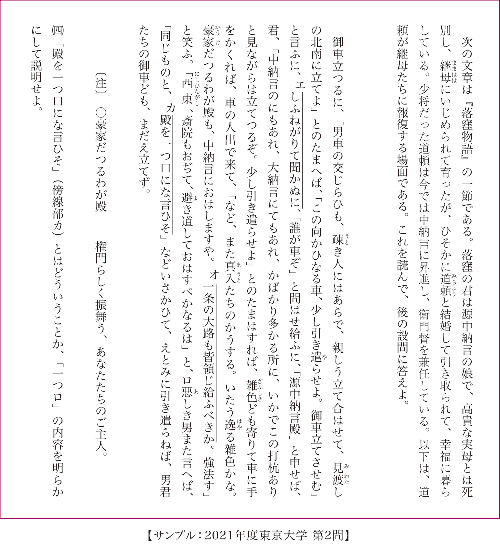上記サンプルは2021年の東大の問題で、『落窪物語』の一節です。具体的には、賀茂の祭りで見物する際の車の場所をめぐって、衛門督側(落窪の君側)の人々と、源中納言側の人々とが言い争っている場面です。この点はリード文に書かれていますが、『落窪物語』についての文学史的知識があれば、なおその情景を想像しやすくなるでしょう。ここでは、特に(四)傍線部カ「殿を一つ口にな言ひそ」を解釈するためにどのような知識や作業が必要になるかを見てみましょう。