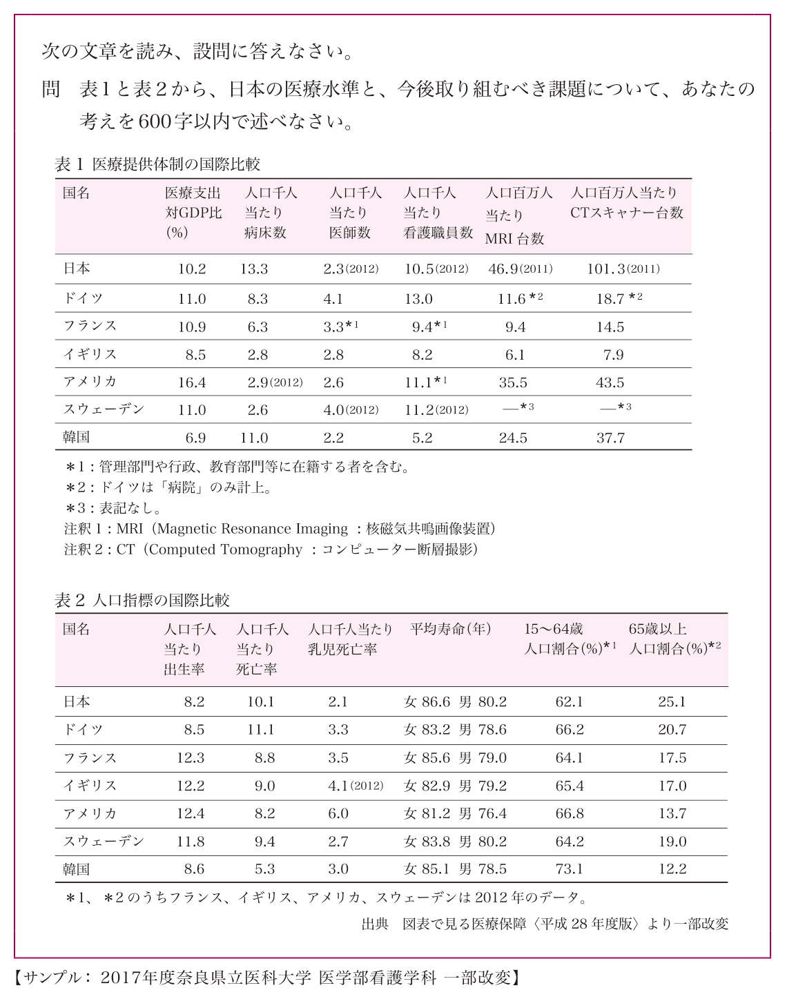 それではどうしたらよいかと言うと、特徴のある部分、すなわち数値などに過度の変化が見られたり、極端であったりする部分に着目します。まずは、与えられた資料について、特徴ある箇所を見つけるのです。上記サンプルの問題の場合、論じなければいけないのは「日本」についてなので、他国と比較して特に顕著な項目を取り上げて、それをもとにして自身の考えを組み立てていきます。