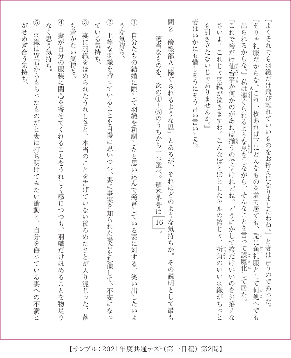 上記のサンプルは、やはり主人公の心情を(比喩的に)表現した箇所に傍線が引かれており、その内容が問われています。ここでは主人公が「擽くすぐられるような思おもい」をする直接的な理由は、妻のセリフ(「飛び離れていいものを…」)にあります。そしてまた、そうした妻への返答の仕方(「…誤