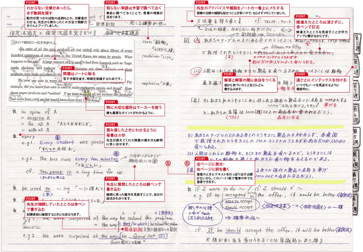 以前はノートの情報量が多すぎてどこを重点的に復習すればいいのかわからなくなり、全部一から復習か…と思うと億劫でやらない、という状態でした。このノートの取り方を確立してからはポイントがわかりやすくなり、復習しやすい→勉強が楽しい→さらに復習がはかどる→成績UPという好循環を生むことができました。