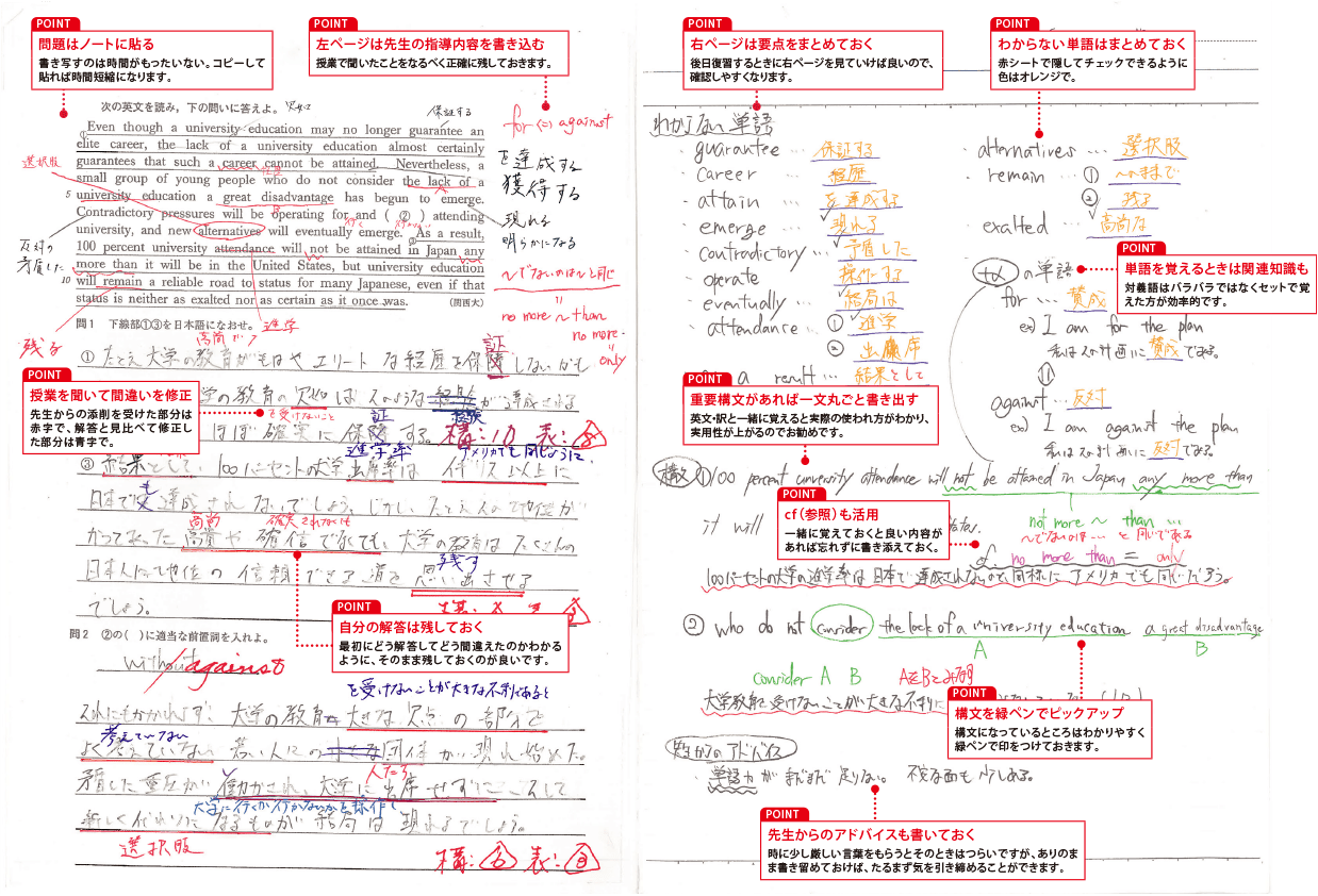 授業で書きためたノートが最強のオリジナル参考書になりました。先生が教えてくれたポイントや間違いを修正した軌跡がつまっているから、ノートを読み返すことで自然と知識が身につきました。