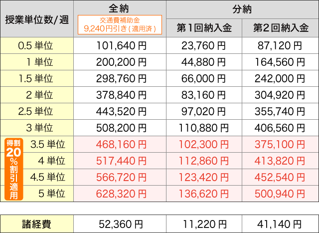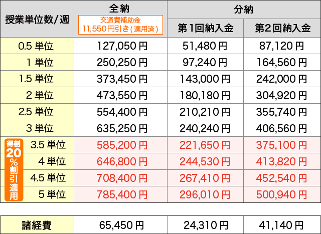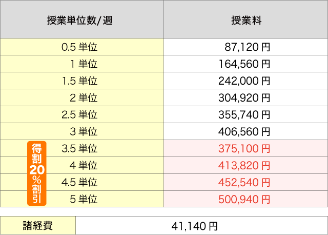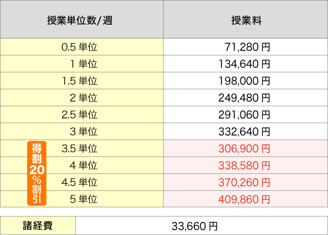 週3.5単位以上は、授業料が20%割引となります。 週3単位の場合は、週3.5単位で申し込む方がお得です。 |