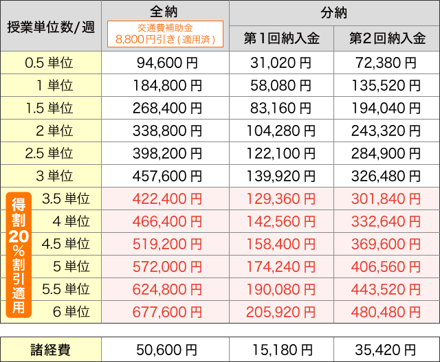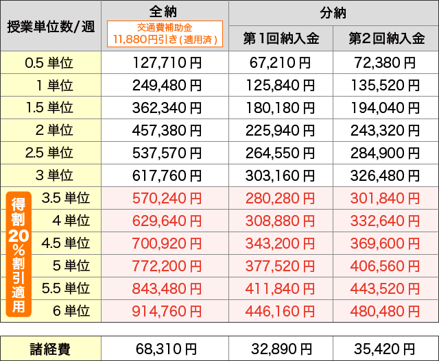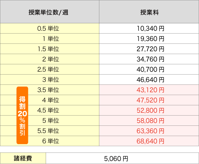 週3.5単位以上は、授業料が20%割引となります。 週3単位の場合は、週3.5単位で申し込む方がお得です。 |