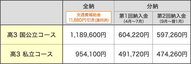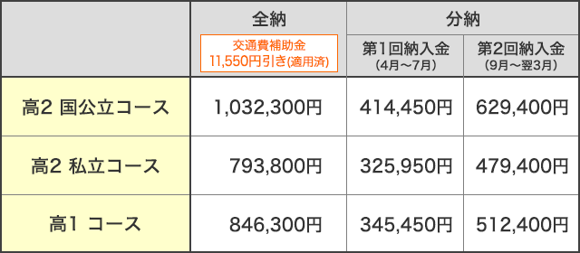 入学時は、入学金・授業料・諸経費・各種オプションの合計金額を納入いただきます。