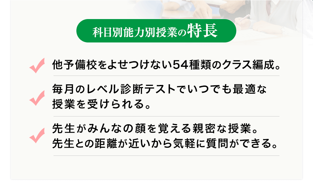 ギャップが生まれやすい志望大学別や教科別得点によるクラス編成とは異なり、科目別にあなたの学力に合った授業が受けられます。