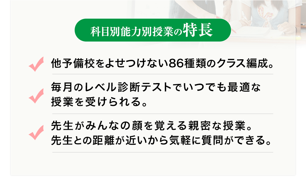 ギャップが生まれやすい志望大学別や教科別得点によるクラス編成とは異なり、科目別にあなたの学力に合った授業が受けられます。