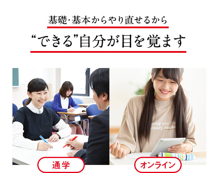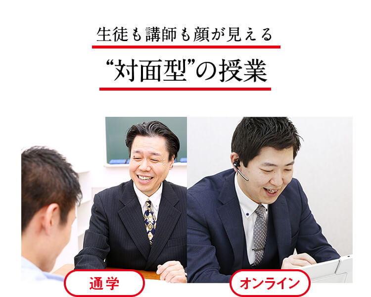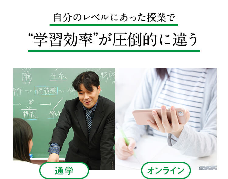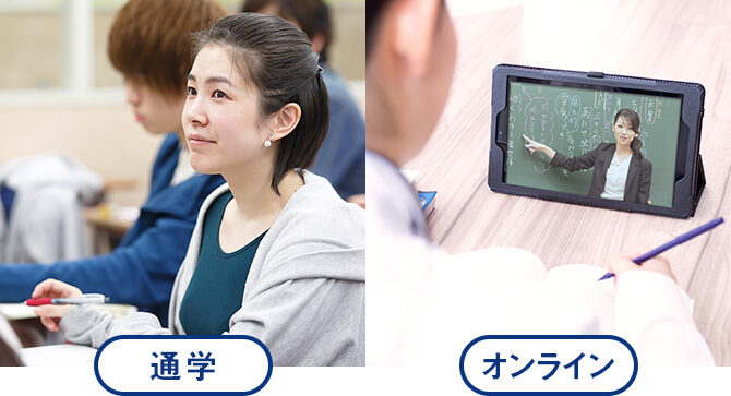 高校生向けの予備校は夕方以降しか授業がありませんが、通→大コースでは日中から夜まであなたの都合に合わせて受講が可能です。また通学受講とオンライン受講から選べます。