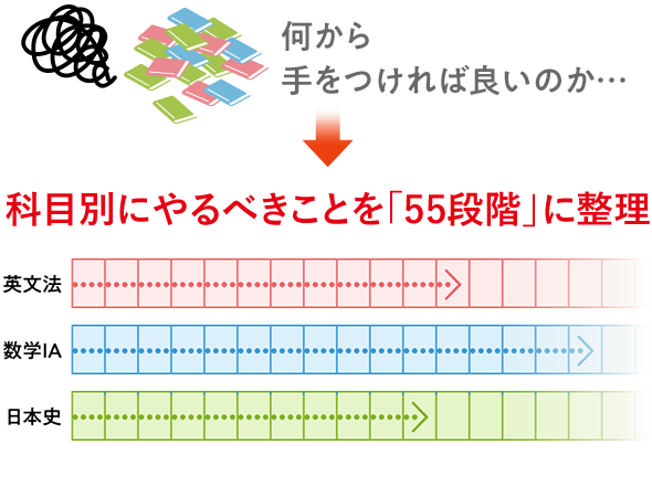 「55段階」は受験に必要な知識やテクニックを網羅し、段階を追って無駄なく学べるよう体系化したものです。部分部分を完成させていくことで全体を完成させていきます。